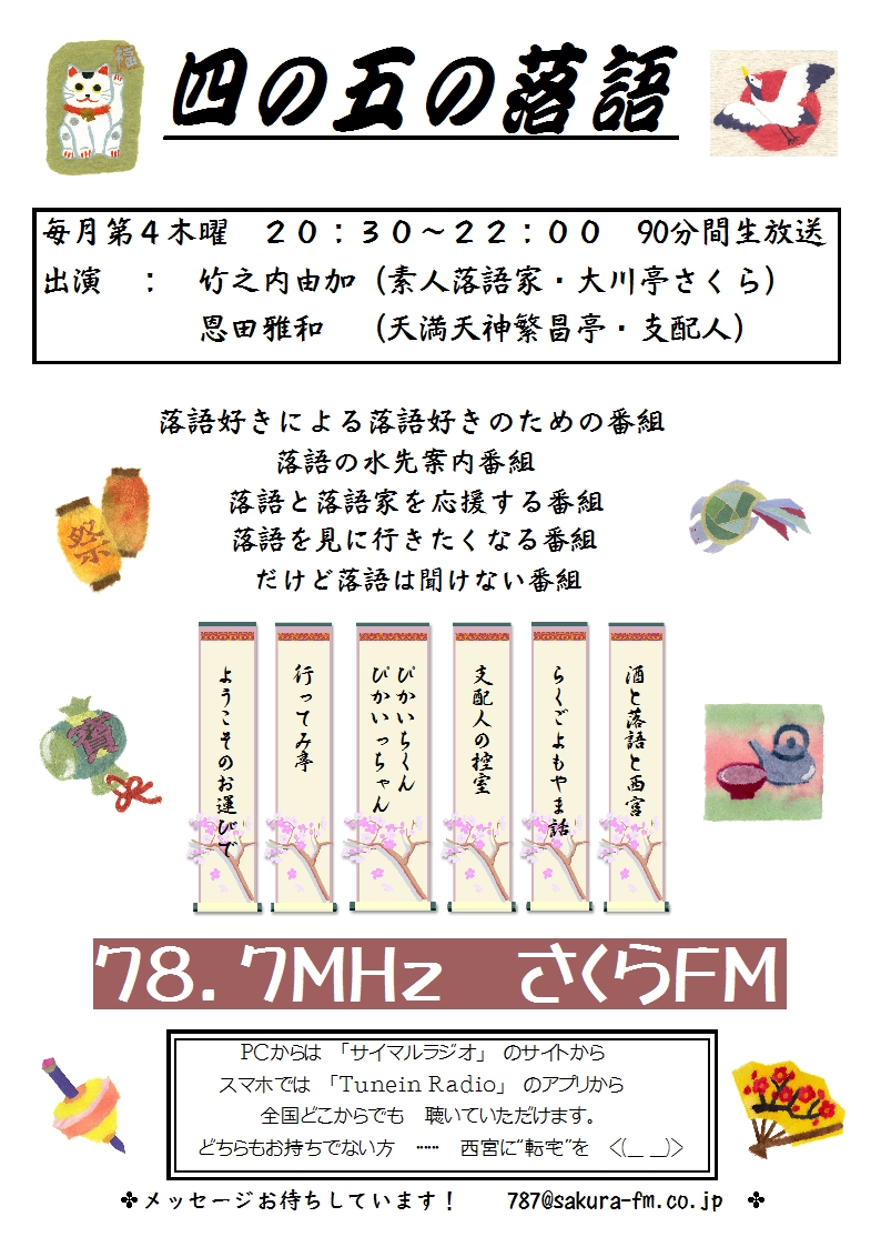 初級編で、桂米輔師匠、桂米左師匠、笑福亭生喬師匠、桂米平師匠の方々に半年間お稽古をつけていただきまして、