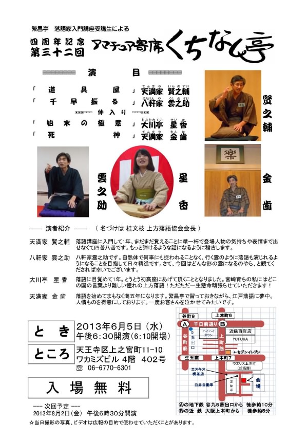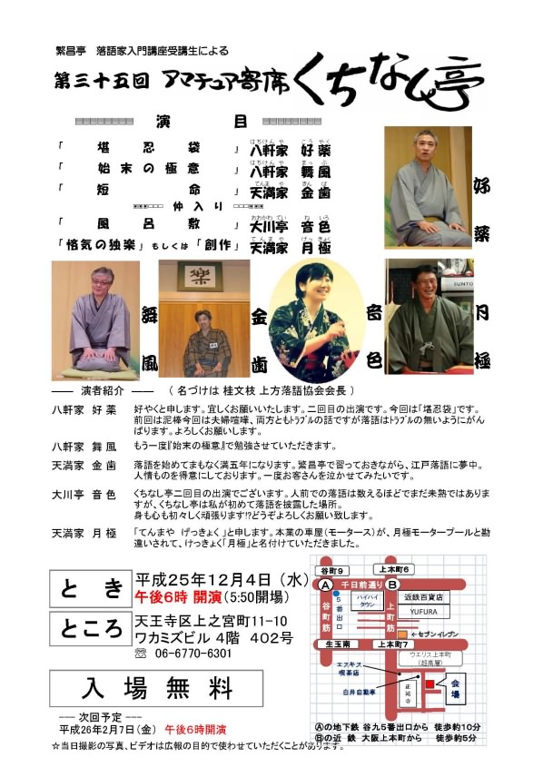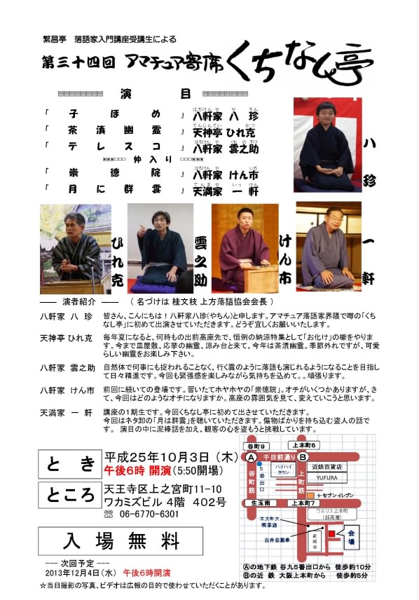 2013年秋からの『落語家入門講座初級コース』の無料説明会は、平成25年10月9日(水)午前10時より繁昌亭で開催されます。