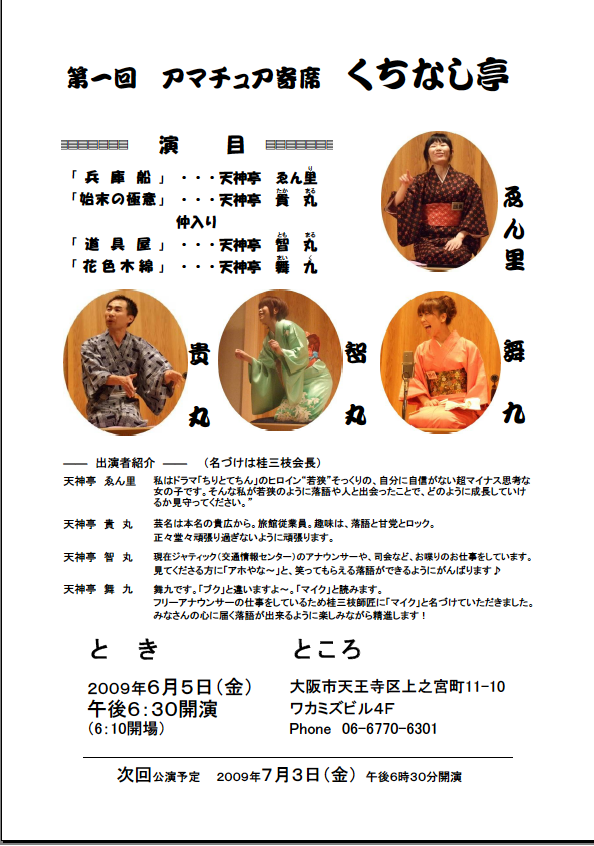落語会「くちなし亭(http://tenmayakouchi.blog.shinobi.jp/Entry/3/)」は先般ご紹介したとおりです。
