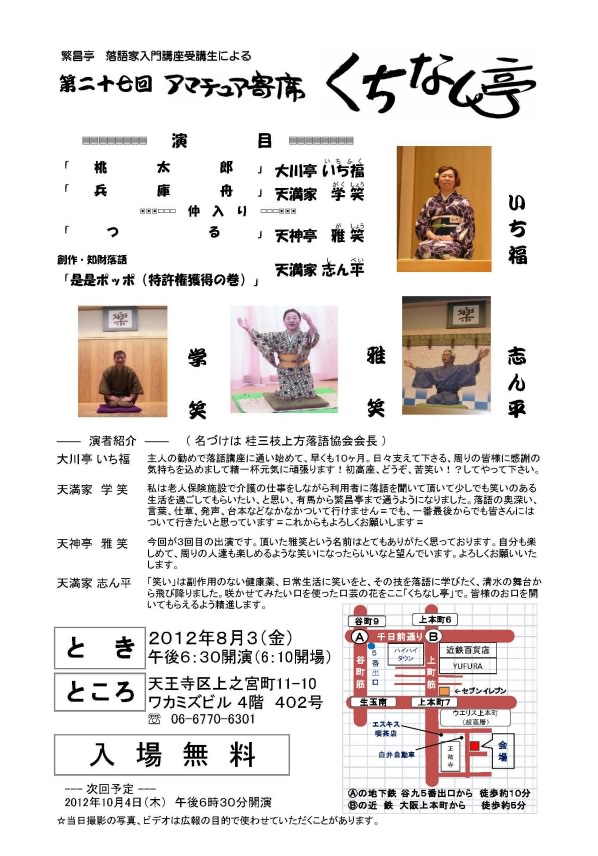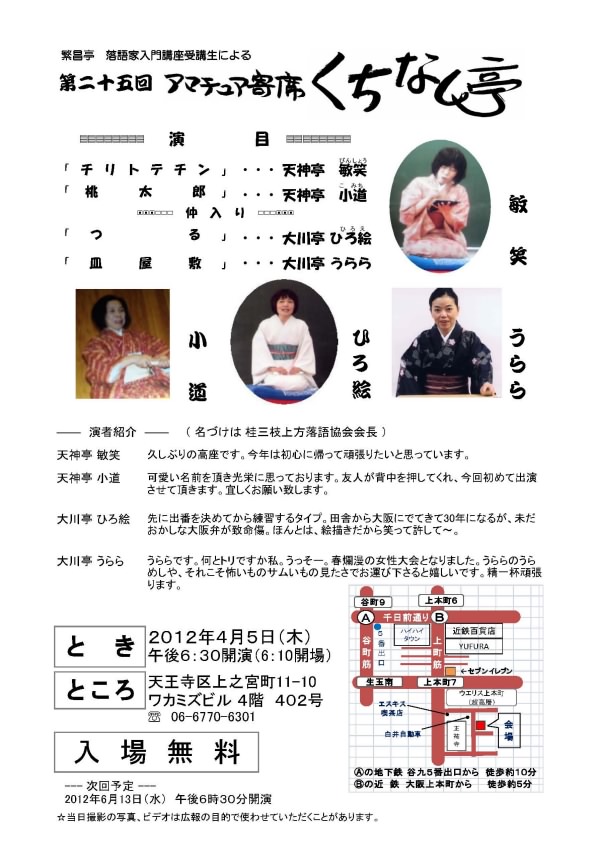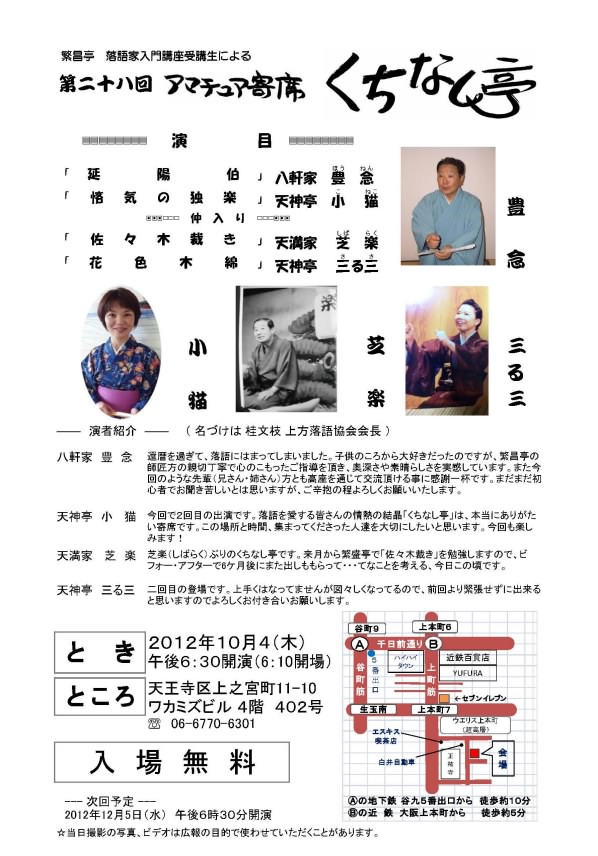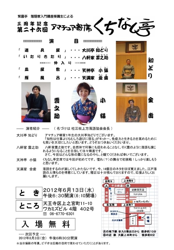 天満天神繁昌亭で一緒に稽古をしておりましたお仲間、そしてそれ以降に通われるようになった方の隔月の舞台のご案内です。