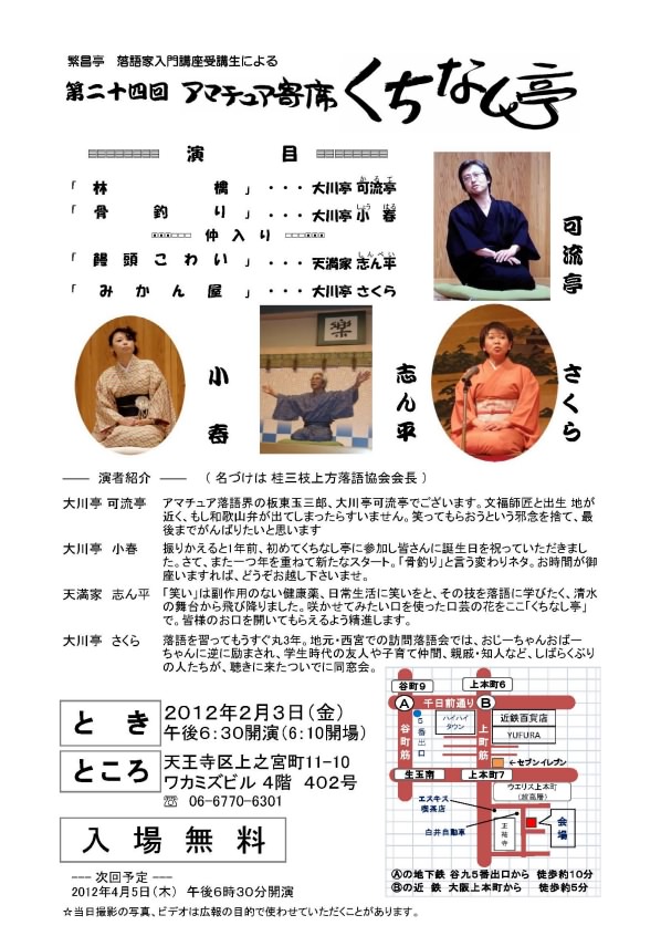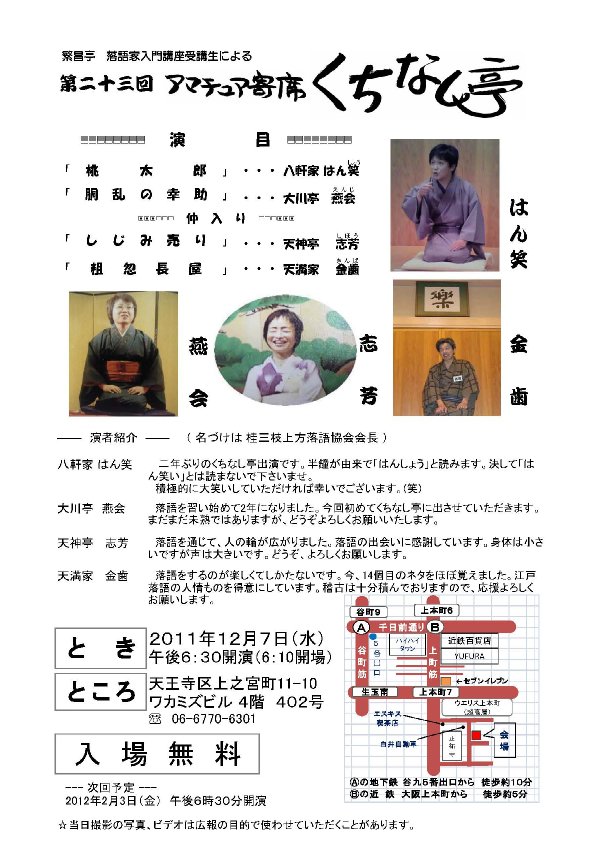 天満天神繁昌亭で一緒に稽古をしておりましたお仲間、そしてそれ以降に通われるようになった方の隔月の舞台のご案内です。