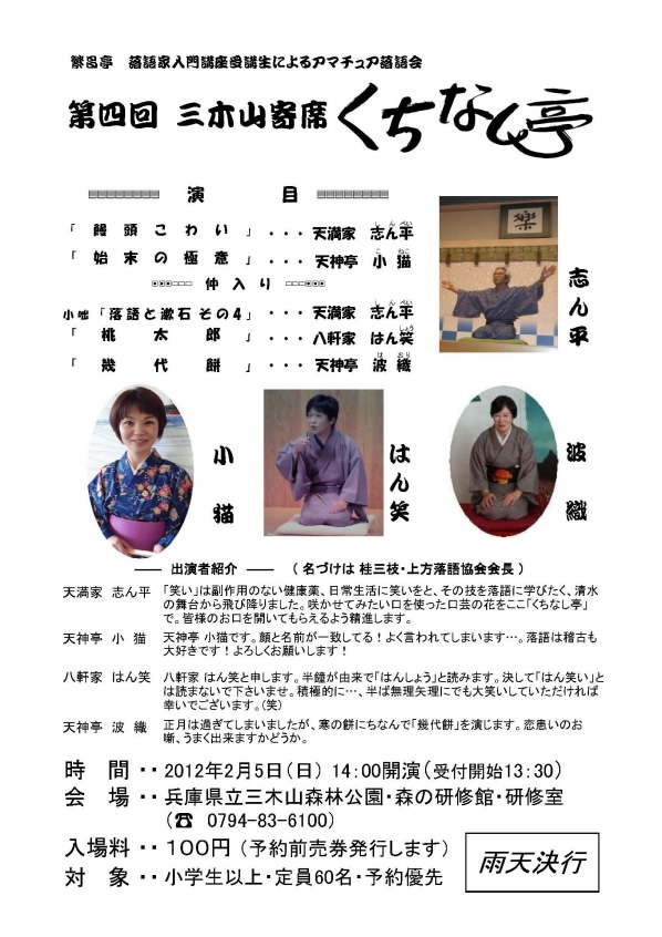 繁昌亭で一緒に稽古をしておりました、そして新人さんのお仲間の舞台(くちなし亭)の出前寄席のご案内です。